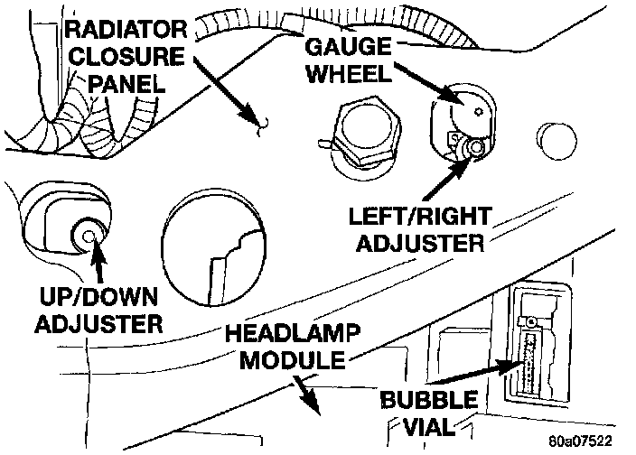JX vehicle headlamps are equipped with a bubble level to aid up/down headlamp alignment. The bubble level is used to assist headlamp alignment when compensating for vehicle ride height changes due to heavy luggage compartment loads. The bubble level cannot be calibrated, the headlamp must be replaced if bubble level vial is faulty. A gauge wheel is located on the top of the headlamp module to assist left/right alignment.