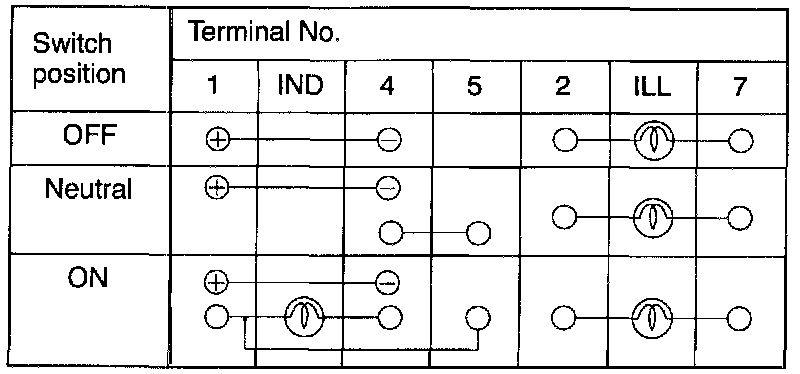 2. When the battery (+) side is connected to terminal 1 and the (-) side is connected to terminal 4, and the main switch is turned to ON, check if battery voltage is output between terminal 5 and the ground until the main switch is turned to OFF.