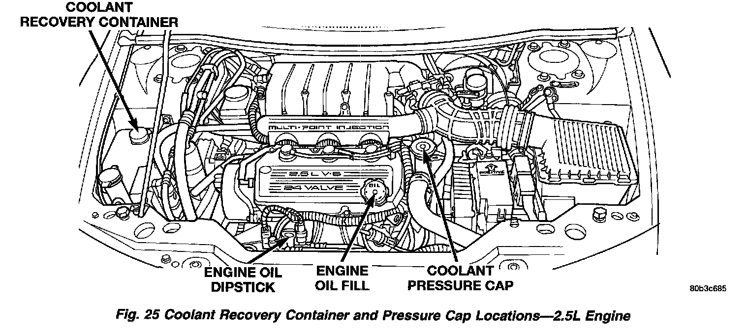 When servicing requires a coolant level check in the radiator, the engine must be off and not under pressure. Drain several ounces of coolant from the radiator drain cock while observing the Coolant Recovery Container. Coolant level in the container should drop slightly. Then remove the radiator cap. The radiator should be full to the top. If not, and the coolant level in the recovery container is at the ADD mark there is a air leak in the recovery system. Check hose or hose connections to the recovery container, radiator filler neck or the pressure cap seal to the radiator filler neck for leaks.