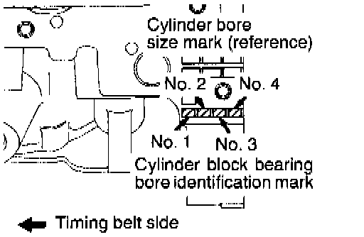(2) The identification mark for the diameter of the cylinder block bearing hole is embossed as shown in the diagram, starting from the No. 1 mark art the front of the engine. Select and install the bearings according to these marks.