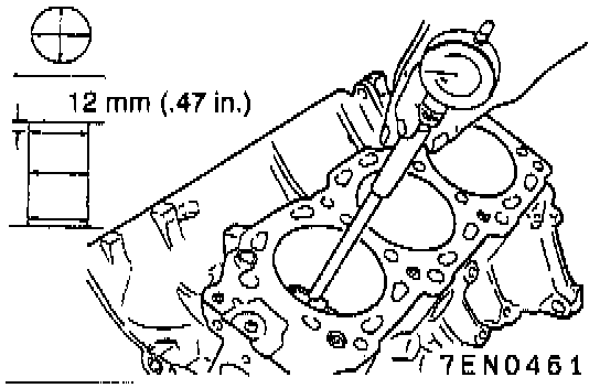(5) Using cylinder gauge, measure the cylinder bore and cylindricity. If worn badly, correct cylinder to an oversize and replace piston and piston rings. Measure at the points shown in illustration.