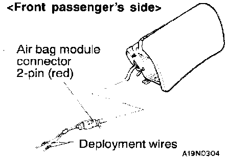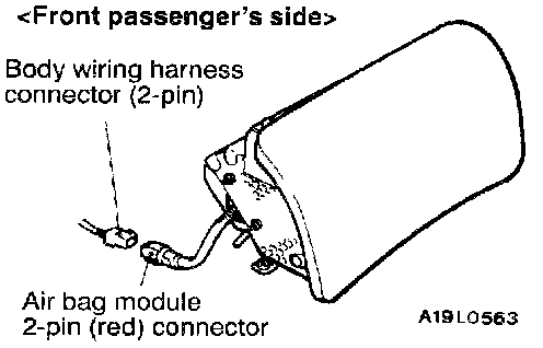 NOTE: If the air bag module (front passenger's side) connector is disconnected from the body wiring harness, both electrodes of the air bag module (front passenger's side) connector will be automatically shorted to prevent unintended deployment of the air bag due to static electricity, etc.