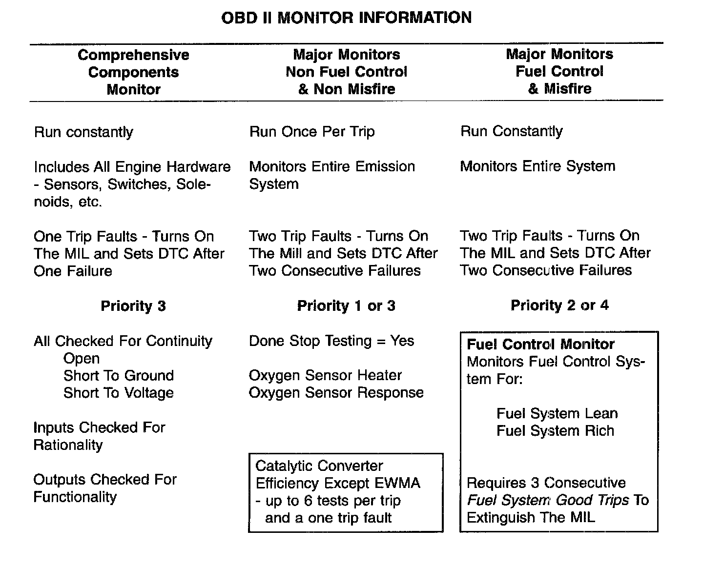The table summarizes the various OBD II monitors operation.