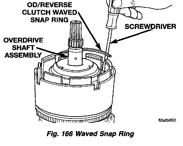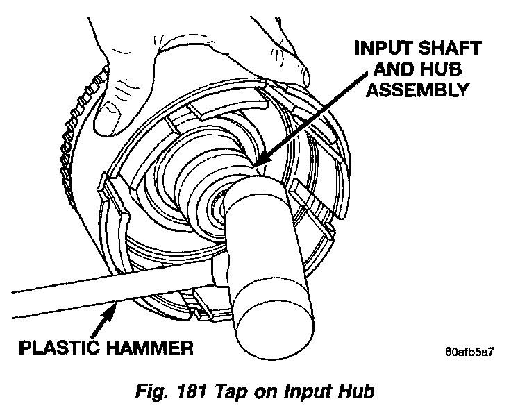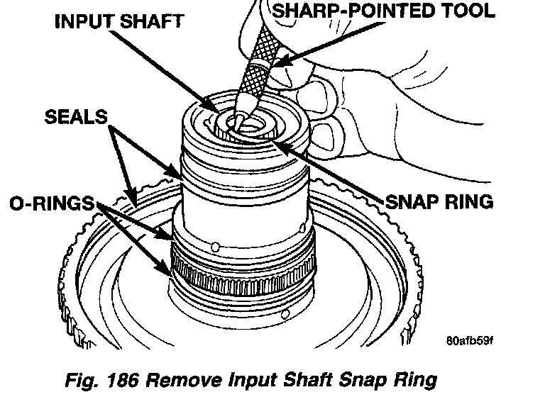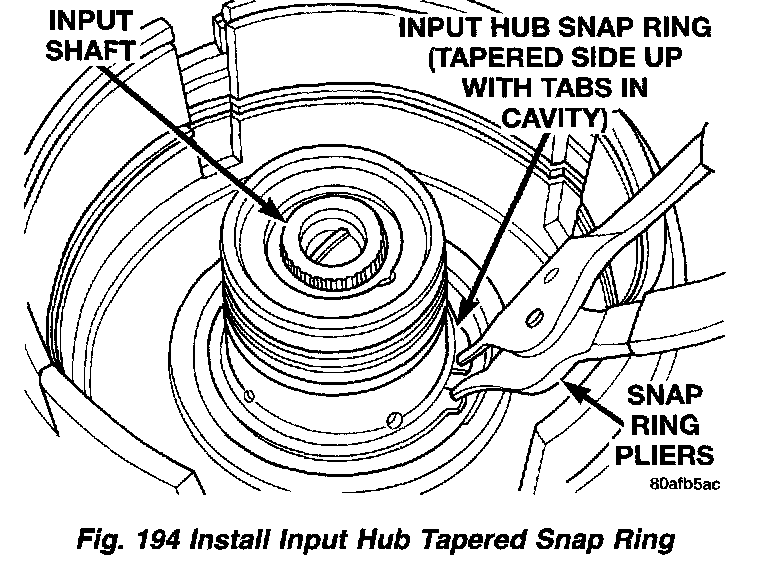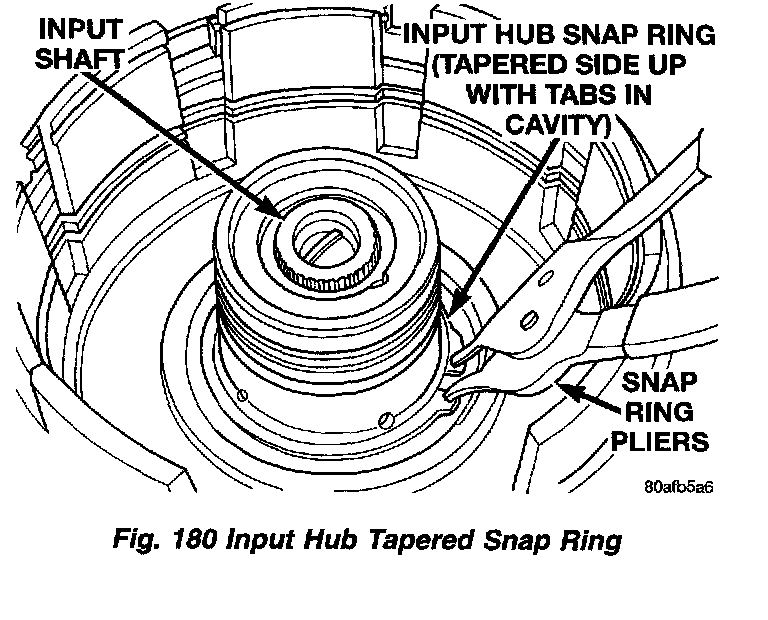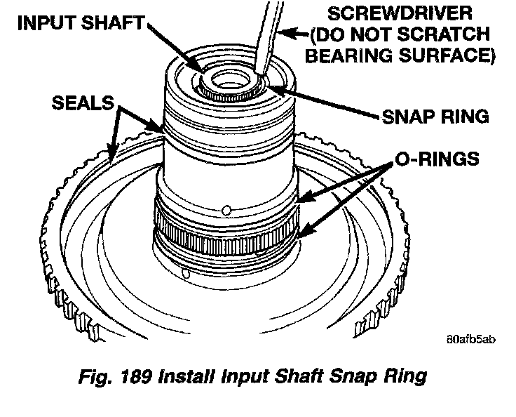 NOTE: Snap ring ends must be located within one finger of the input clutch hub. Be sure that snap ring is fully seated, by pushing with screwdriver, into snap ring groove all the way around.