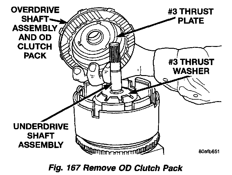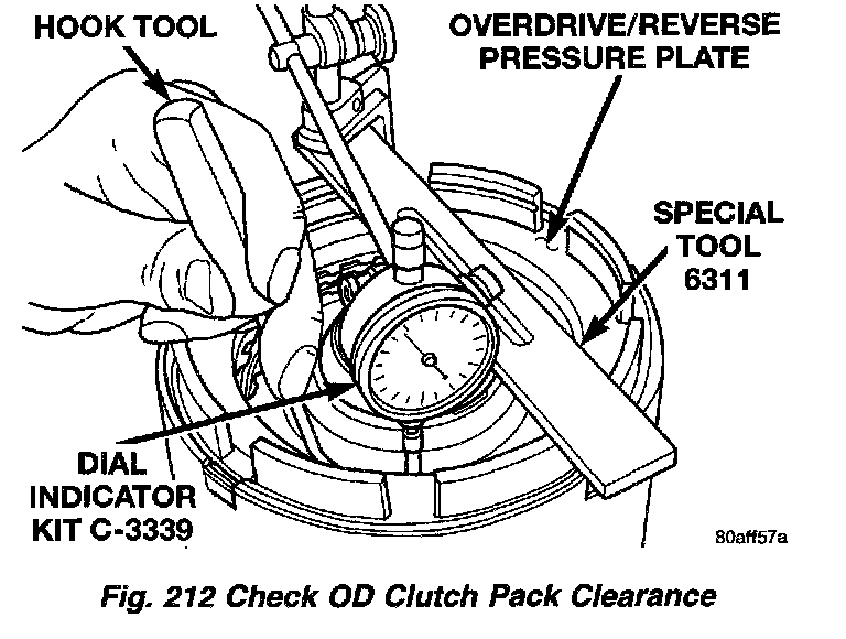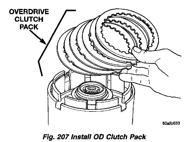 The overdrive (OD) clutch pack clearance is 1.355 to 3.188 mm (0.053 to 0.125 inch). If not within specifications, the clutch is not assembled properly. There is no adjustment for the OD clutch clearance.