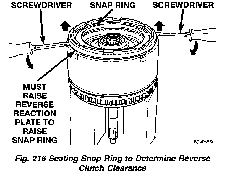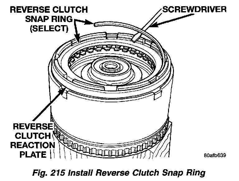 The reverse clutch pack clearance is 0.76 to 1.24 mm (0.030 to 0.049 inch). Select the proper reverse clutch snap ring to achieve specifications: