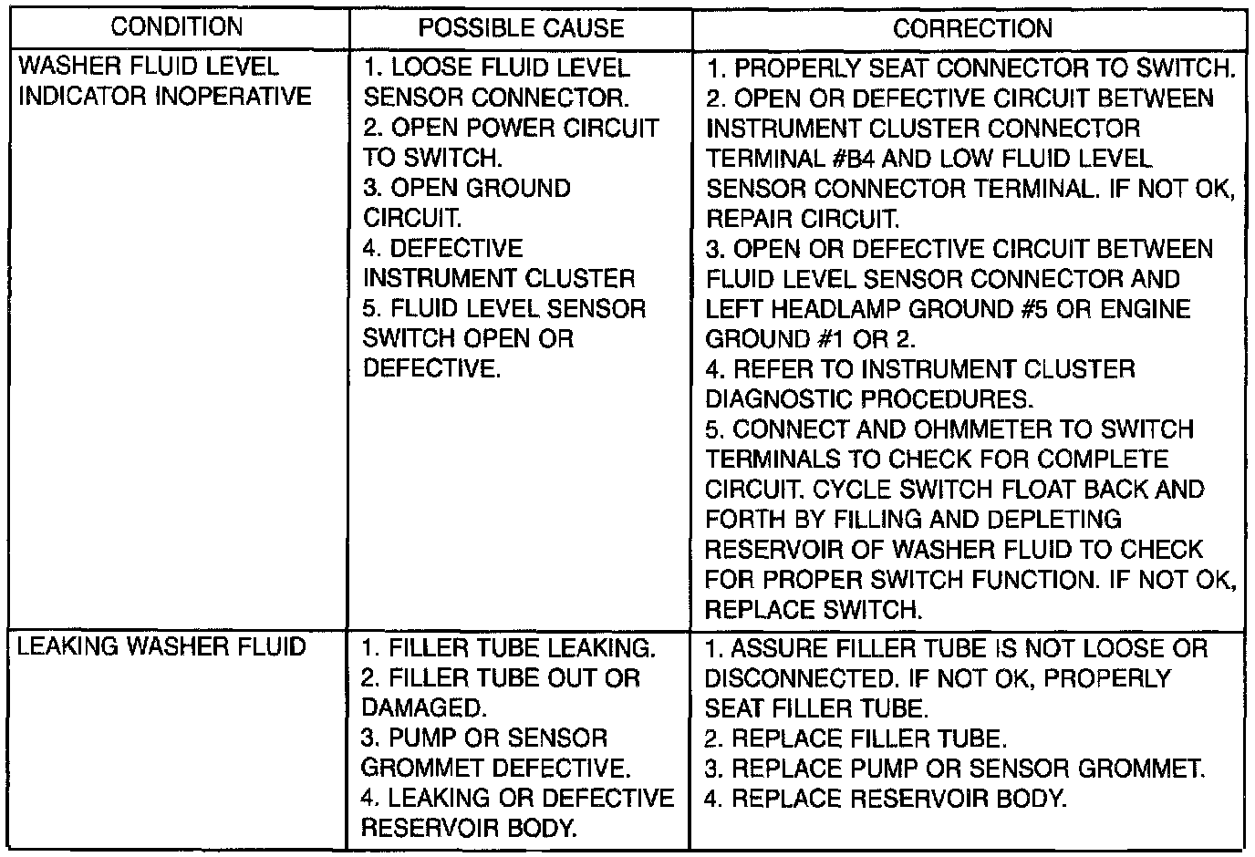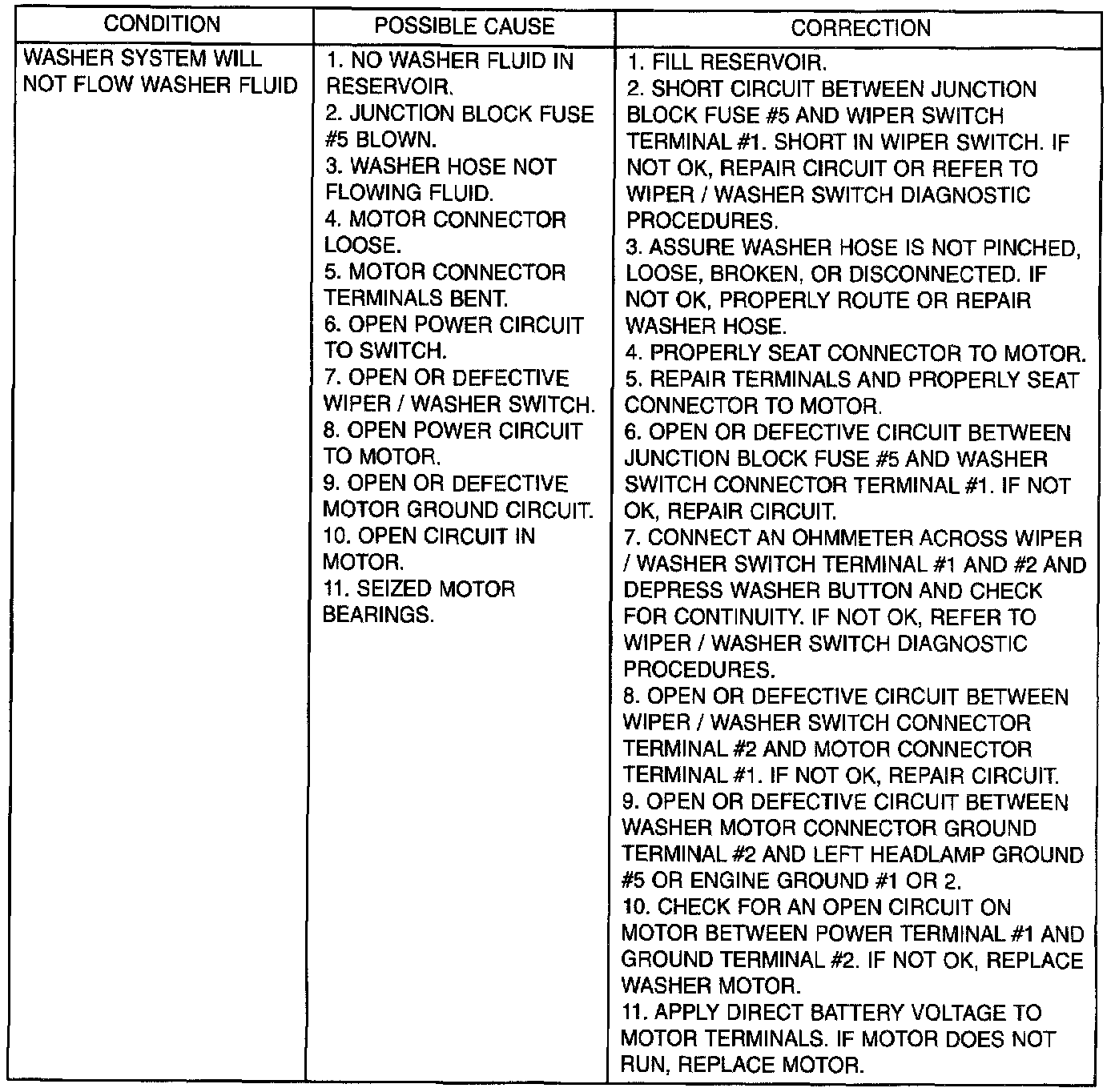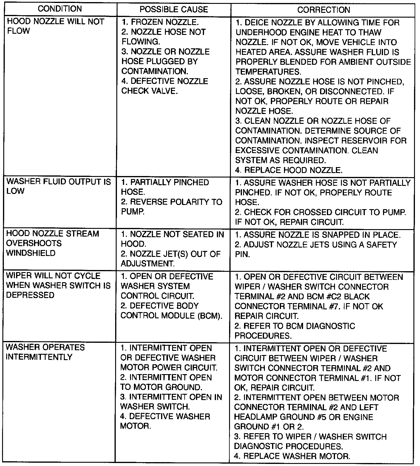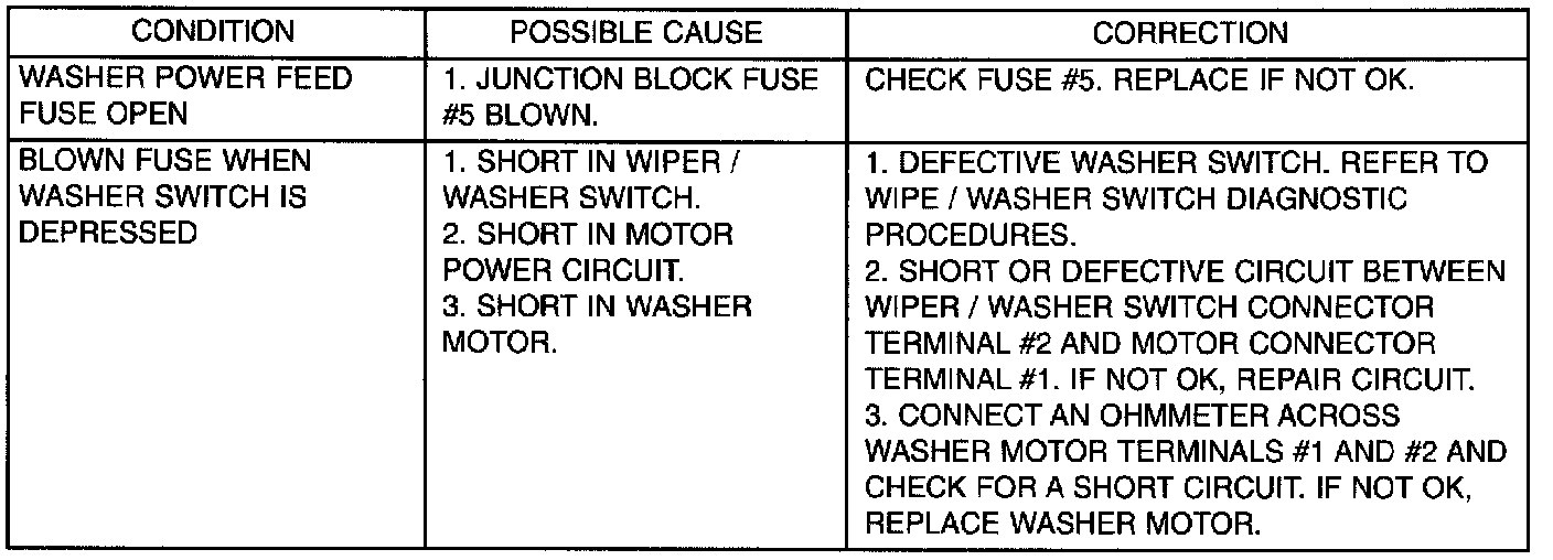 Whenever a windshield washer malfunction occurs, first verify that the windshield washer wire harness is properly connected to all connectors before starting normal diagnosis and repair procedures. Refer to Windshield Washer Test table.