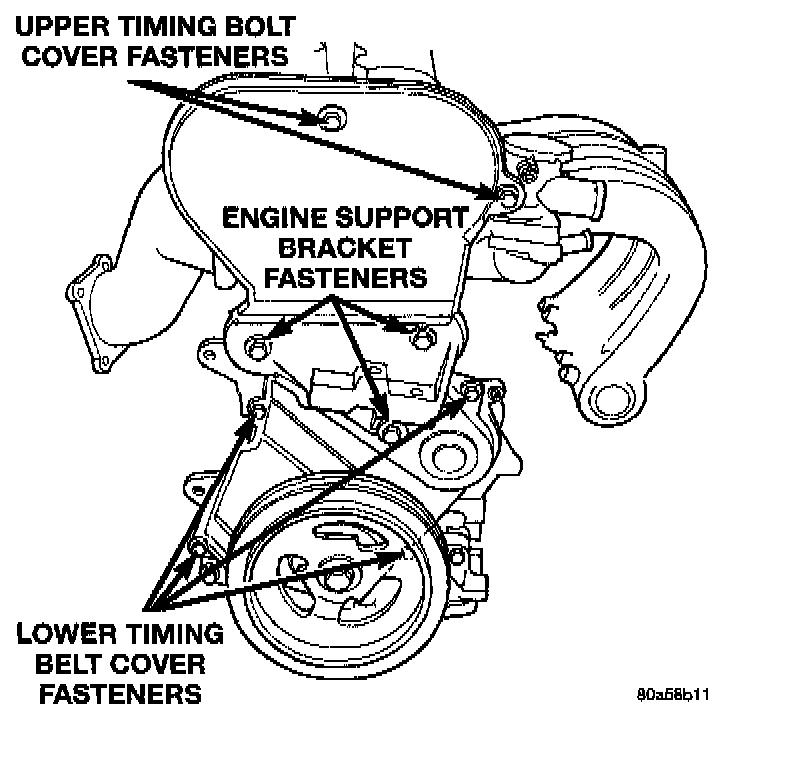 7. Lower vehicle and remove upper timing belt cover fasteners and remove cover.