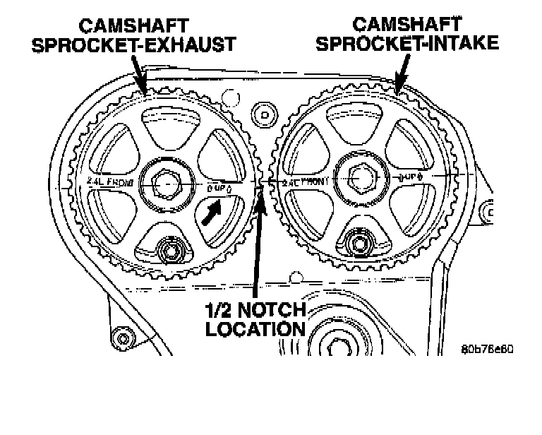 2. Set camshafts timing marks so that the exhaust camshaft sprocket is a 1/2 notch below the intake camshaft sprocket.