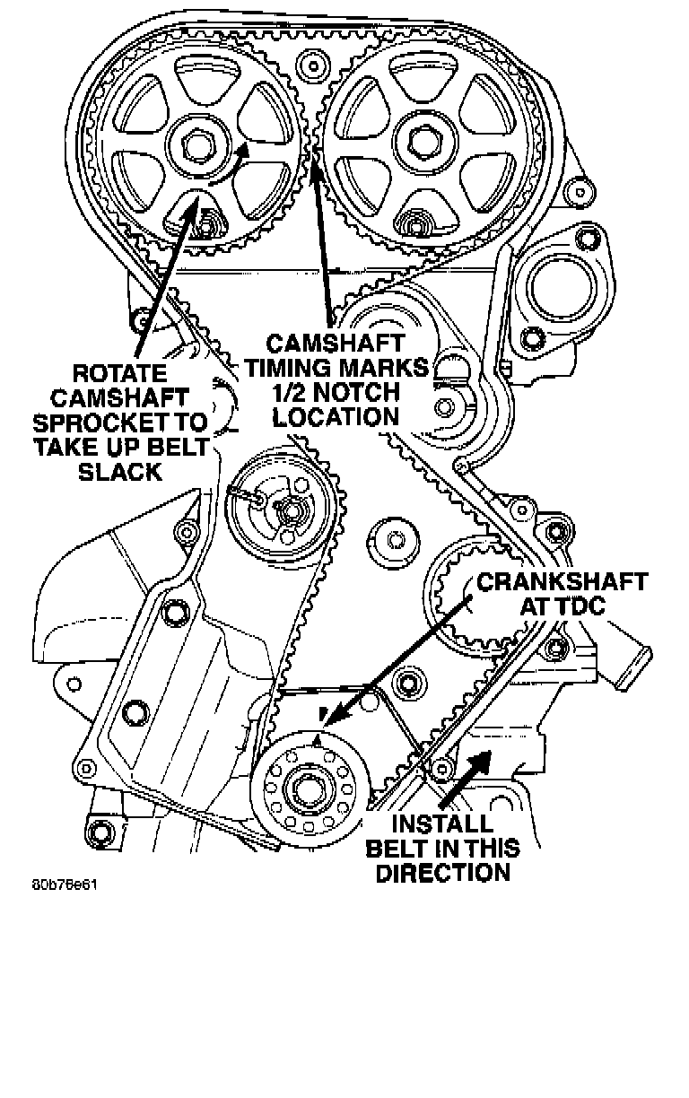 CAUTION: When aligning crankshaft and camshaft timing marks always rotate engine from crankshaft. Camshaft should not be rotated after timing belt is removed. Damage to valve components may occur. Always align timing marks before removing timing belt.