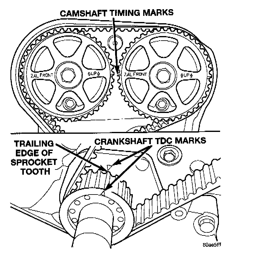 6. Once the timing belt has been installed and tensioner released, rotate the crankshaft two (2) complete revolutions. Verify that the TDC marks on crankshaft and timing marks on the camshafts are aligned as shown in illustration.