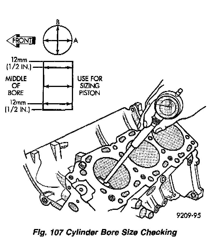 Measure the cylinder bore at three levels in directions A and B. Top measurement should be 12 mm (0.50 inch) down and bottom measurement should be 12 mm (0.60 inch) up from bottom of bore. Refer to Cylinder Bore and Specification Chart.