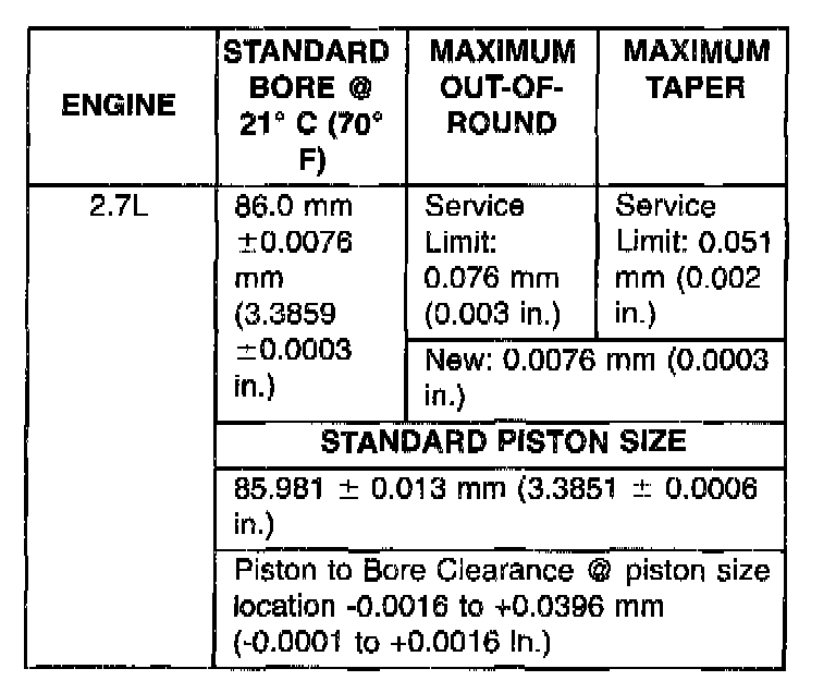 CYLINDER BORE AND PISTON SPECIFICATION CHART