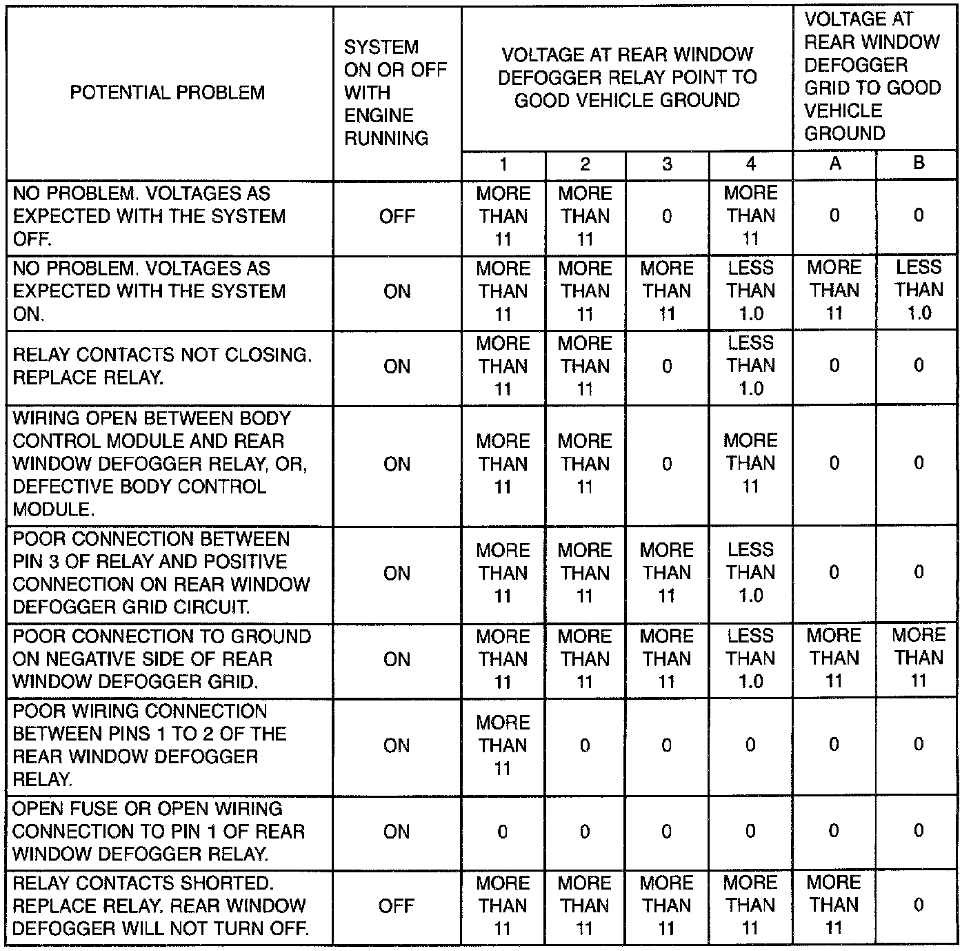2. Reconnect rear window grid connections disconnected during the Fuse and Electrical Short Test. Start engine and with the system OFF, check the voltages present at the rear window defogger relay and rear window defogger grid. Refer to the Rear Window Defogger Relay Test table for diagnosis.