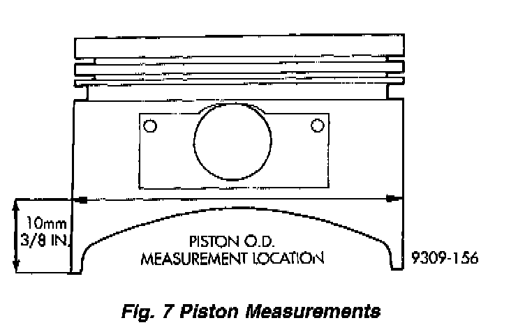 Piston and cylinder wall must be clean and dry. Piston diameter should be measured 90 degrees to piston pin at size location shown in illustration. Cylinder bores should be measured halfway down the cylinder bore and transverse to the engine crankshaft center line. Refer to Cylinder Bore and Piston Specification Chart. Pistons and cylinder bores should be measured at normal room temperature, 70°F (21°C).