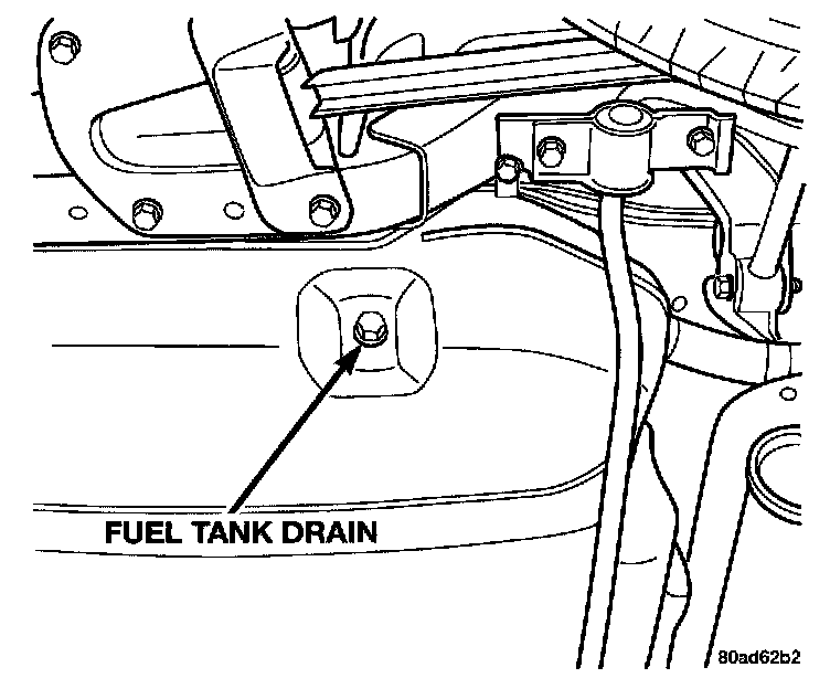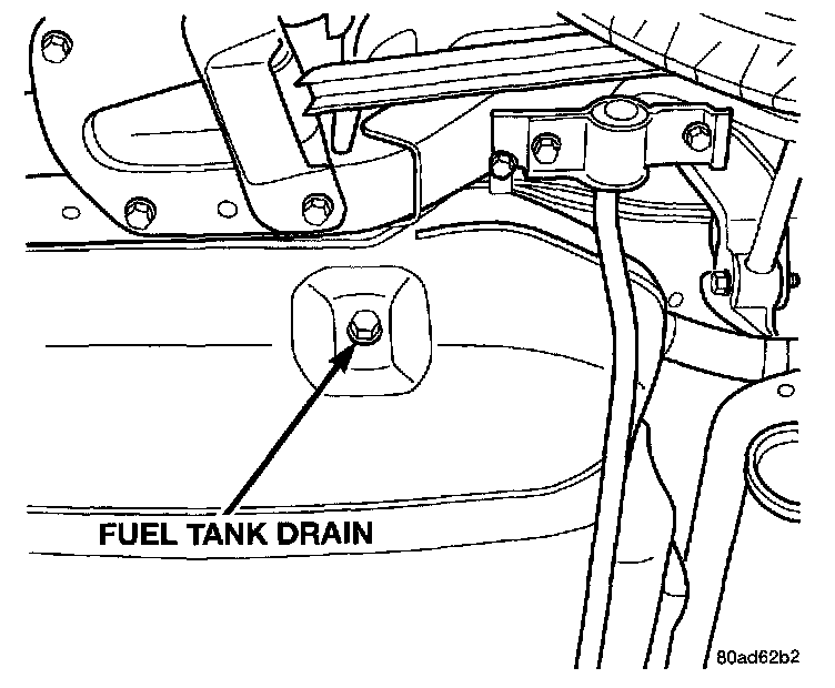 Raise and support vehicle on hoist. Obtain the proper container for GASOLINE. Remove drain plug and drain fuel tank.