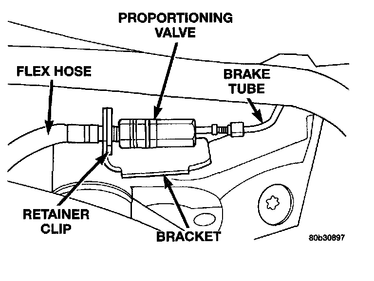 4. Remove the proportioning valve from the rear flex hose which is held stationary by a bracket mounted on the back side of the crossmember.