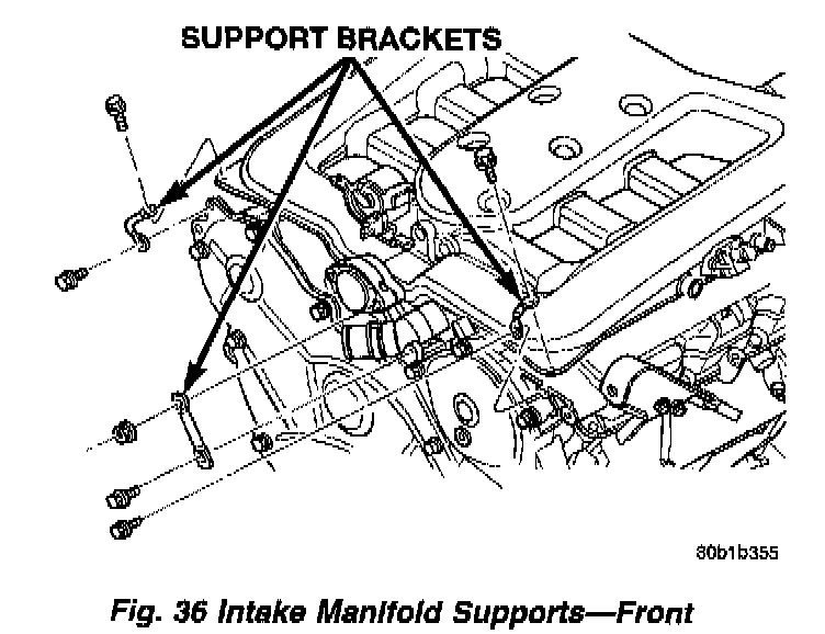 7. Remove support brackets at intake manifold front corners and at MTV.