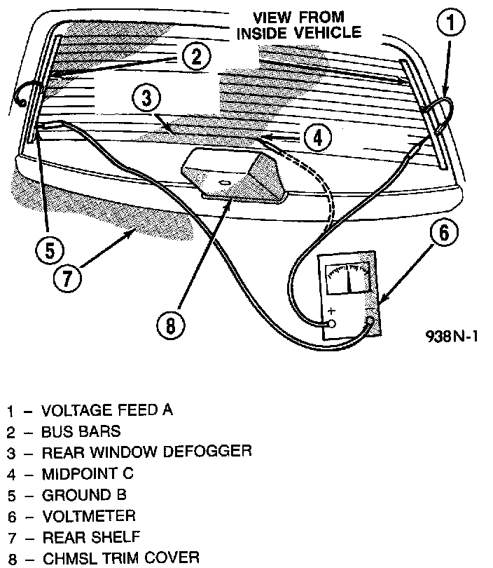 3. Touch the ground side (point B) of the Rear Window Defogger Grid. The voltage measured should be below 1 volt. If the voltage is greater than 1 volt then check the voltage on each grid line at the Midpoint with the positive lead. If the voltage is not approximately 6 volts or half the voltage measured on the positive rear window grid bus bar, then the grid line is bad. The break in the grid can be found by moving the probe along the line until the voltage changes. The area where the voltage changes is where the open circuit is.