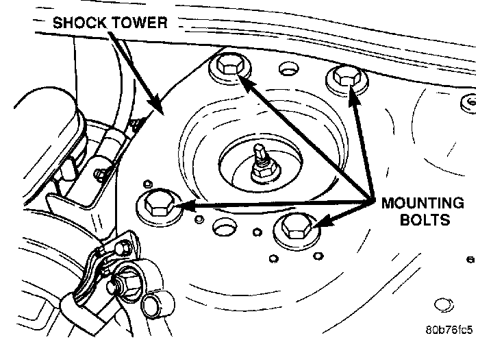 3. Loosen the shock assembly mounting bolts on the side marked in step 1. Loosen the bolts enough to allow adequate space for removal of the plastic locating pins that align the upper mounting bracket with the shock tower.