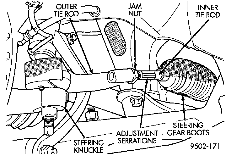2. Loosen front inner to outer tie rod end jam nuts. Grasp inner tie rods at serrations and rotate inner tie rods of steering gear to set front toe to the preferred toe specification.