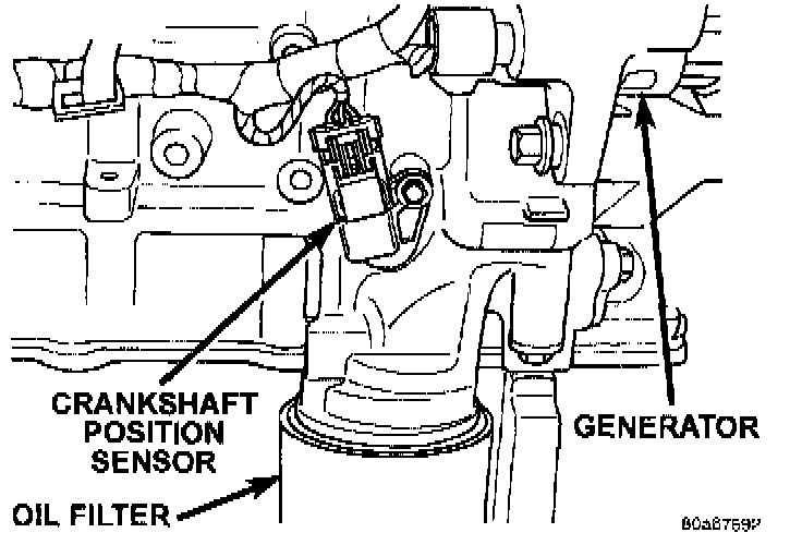 The crankshaft position sensor mounts to the engine block behind the generator, just above the oil filter.