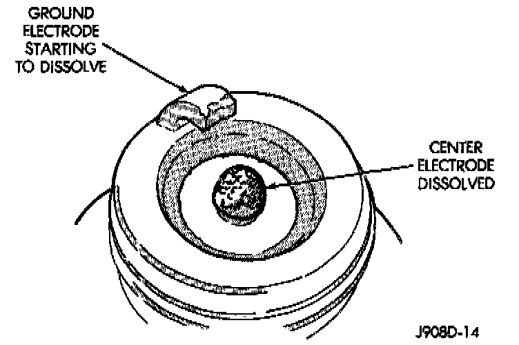 Excessive combustion chamber temperature can cause preignition damage. First, the center electrode dissolves and the ground electrode dissolves somewhat later. Insulators appear relatively deposit free. Determine if the spark plugs are the correct type, as specified on the VECI label, or if other operating conditions are causing engine overheating.