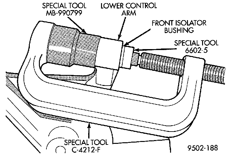 3. Install lower control arm on Special Tools assembled for removal of the front isolator bushing. Be sure Special Tool MB-990799 is square on lower control arm and Special Tool 6602-5 is positioned correctly on isolator bushing.