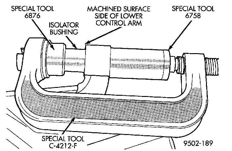 3. Install lower control arm on Special Tools assembled for installation of front isolator bushing into lower control arm. Be sure Special Tool 6758 is square on lower control arm and Special Tool 6876 is positioned correctly on isolator bushing.