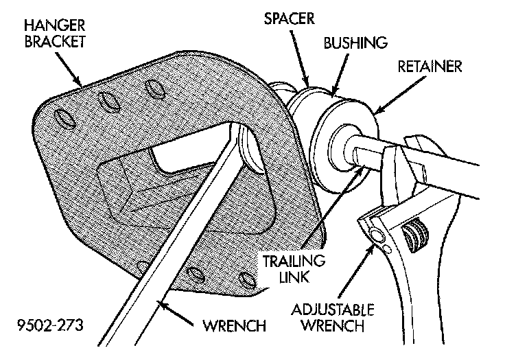 6. Separate the trailing link from the hanger bracket. To separate trailing link from hanger bracket, use a large adjustable wrench on flat of trailing link to turn link while holding nut stationary.