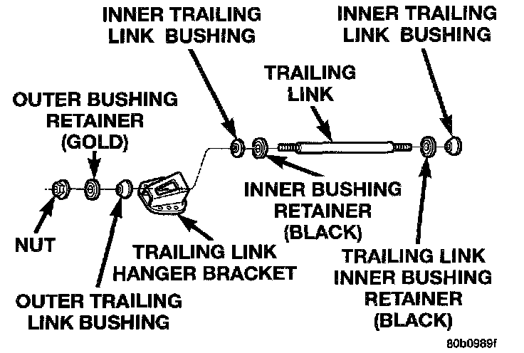 1. Install the (black) inner bushing retainer, and inner bushing on the trailing link. Install the trailing link, retainer and bushing on the hanger bracket. Then install the outer bushing, (gold) outer bushing retainer and nut on the trailing link. Using a large adjustable wrench on flat of trailing link to keep it from rotating, tighten the trailing link retaining nut to a torque of 99 Nm (73 ft. lbs.).