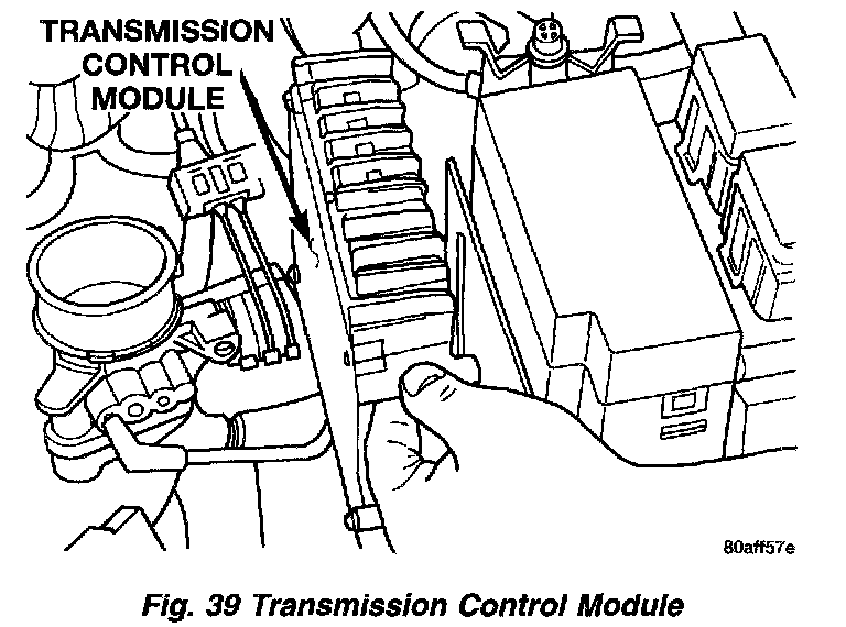 The transmission control module is next to the battery on the left side of vehicle, in the engine compartment. It is held in place by three mounting screws.