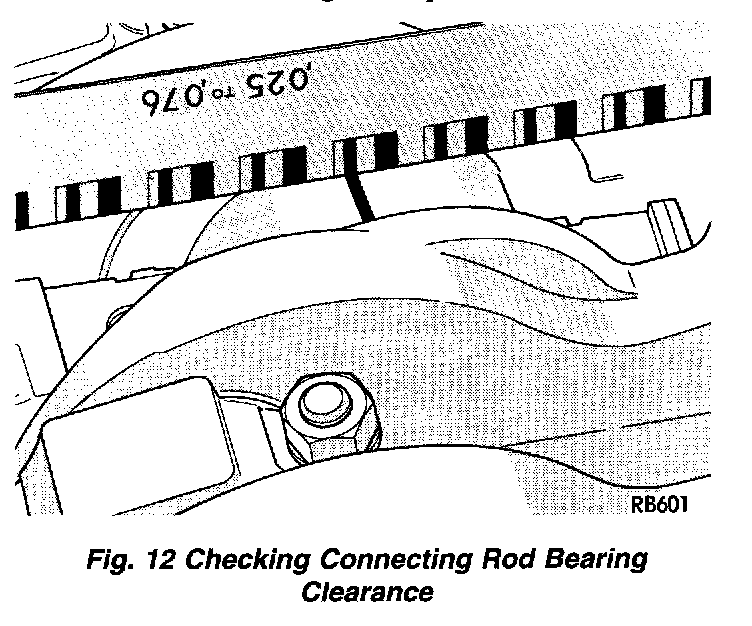 1. Follow the procedures outlined in the Standard Service Procedures found under Engine, Service and Repair for Measuring Main Bearing and Connecting Rod Bearing Clearances (Fig. 12). Refer to Connecting Rod Specification Chart.