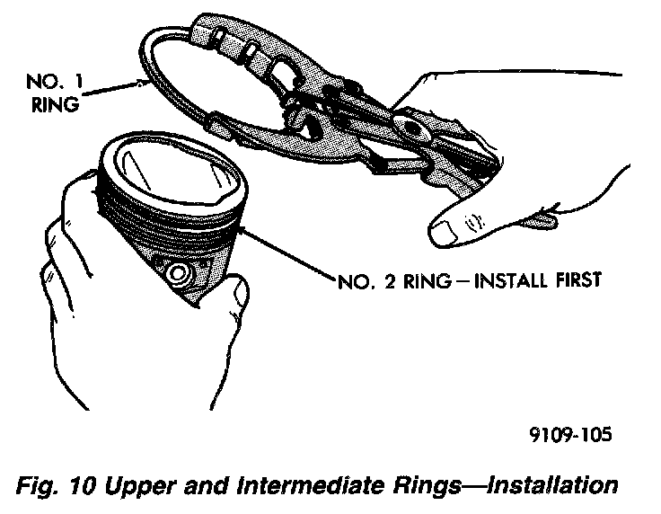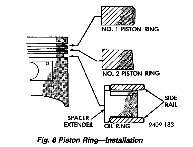 1. The No. 1 and No. 2 piston rings have a different cross section. Install rings with manufacturers mark and size mark facing up, to the top of the piston (Fig. 8).