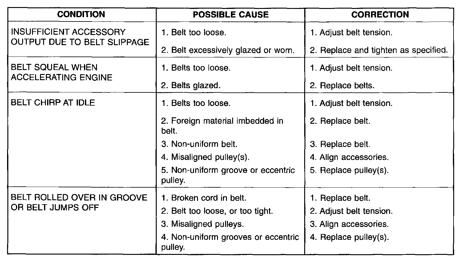 Satisfactory performance of the belt driven accessories depends on belt condition and proper belt tension.