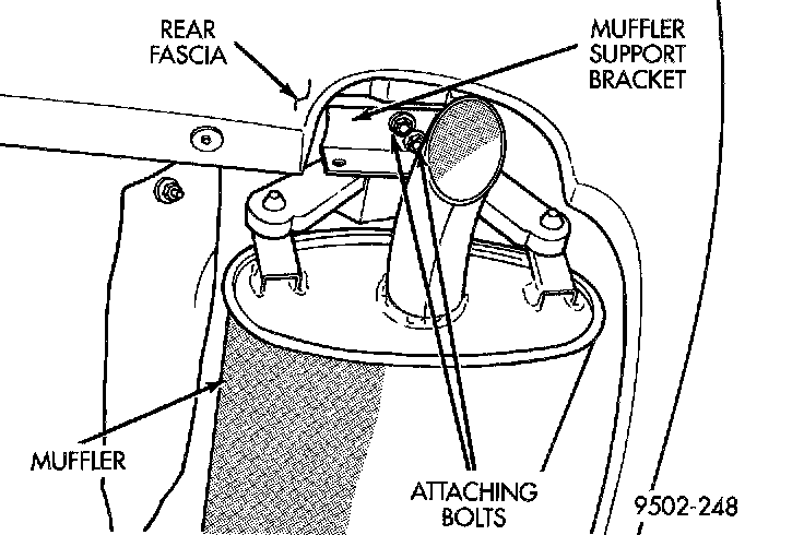 6. Install muffler support bracket on rear frame rail. Install rear exhaust pipe hanger on rear suspension crossmember.