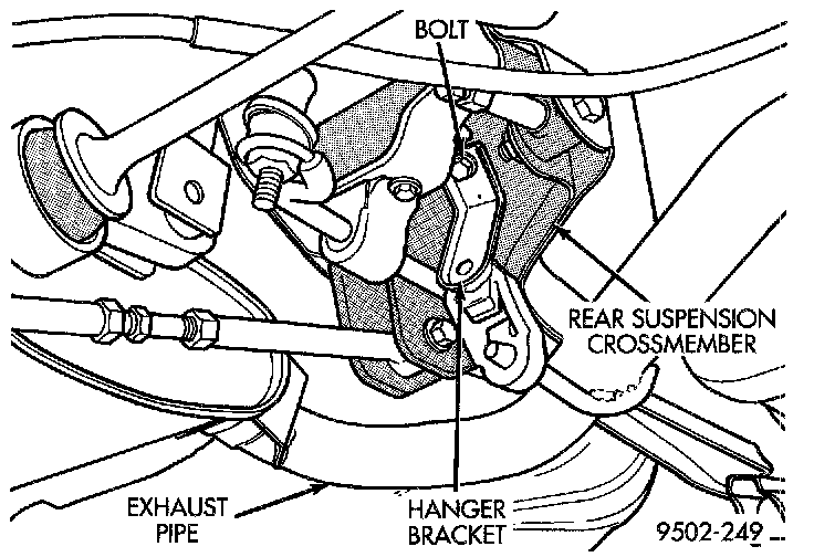 5. Remove the rear exhaust pipe hanger bracket from the rear suspension crossmember. Let exhaust system drop down as far as possible.