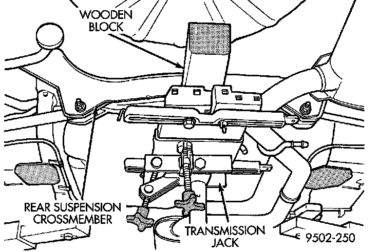 7. Position a transmission jack and wooden block. under the center of the rear suspension crossmember to support and lower crossmember during removal.