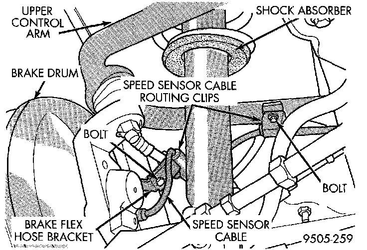 7. Install the wheel speed sensor cable routing clip on upper control arm mounting bracket. Install and securely tighten attaching bolt.