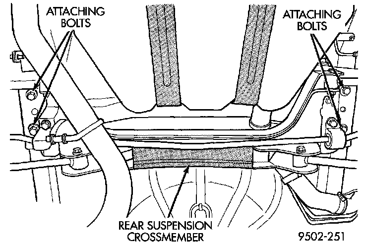9. Remove the 4 bolts attaching rear suspension crossmember to rear frame rails.