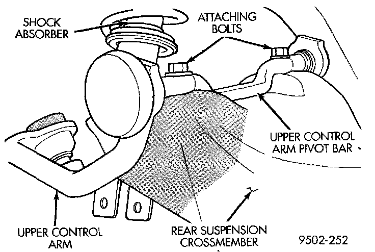 NOTE: One flat washer is used at each upper control arm pivot bar attaching bolt. The flat washer is located between the pivot bar and the rear suspension crossmember. Be sure the washers are not lost when removing the pivot bar attaching bolts from the rear suspension crossmember.