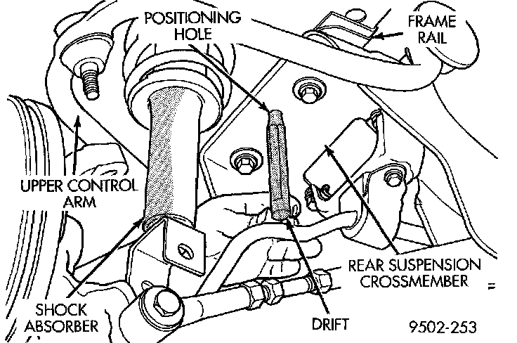 3. Position an appropriate size drift into the positioning hole in each side of rear suspension crossmember and crossmember locating holes in frame rails of the vehicle. This is required to properly position rear suspension crossmember in the body of the vehicle. Then tighten the 4 crossmember to frame rail attaching bolts to 108 Nm (80 ft. lbs.). Remove drifts from rear suspension crossmember.