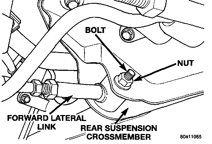 1. Install the lateral link and the attaching nut and bolt at rear suspension crossmember. The forward lateral link is to be installed with the cup in cast portion facing down and toward rear knuckle.