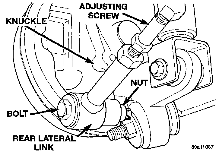 1. Install the lateral link and the attaching nut and bolt at rear suspension crossmember. The rear lateral link is to be installed with the adjusting screw toward rear knuckle not rear suspension crossmember.