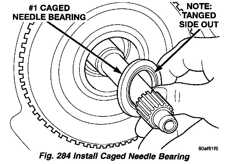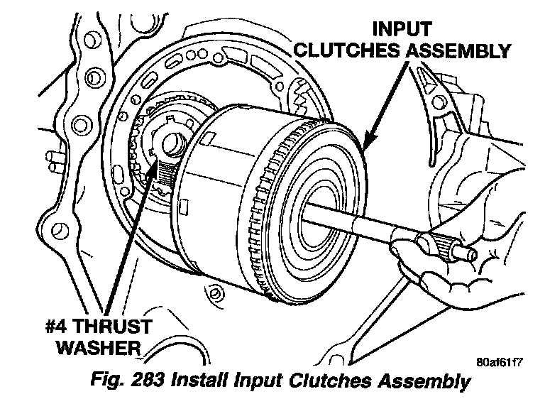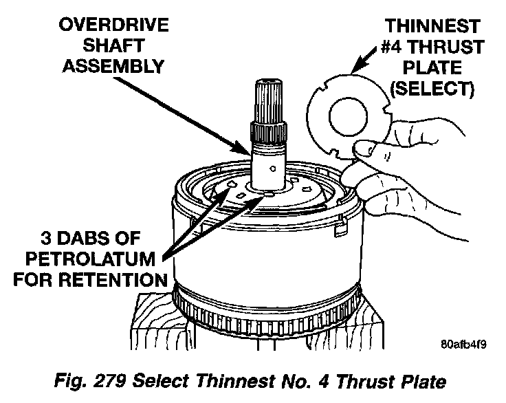 To determine the proper thickness of the No. 4 thrust plate, select the thinnest No. 4 thrust plate. Using petrolatum (Fig. 279) to hold thrust plate in position, install input clutch assembly. Be sure the input clutch assembly is completely seated (Fig. 280).