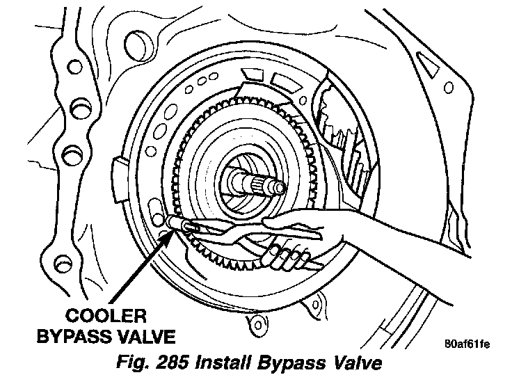 CAUTION: The cooler bypass valve must be replaced if a transaxle failure has occurred. Do not reuse old valve or attempt to clean old valve. When installing bypass valve, insert with O-ring end towards rear of case.
