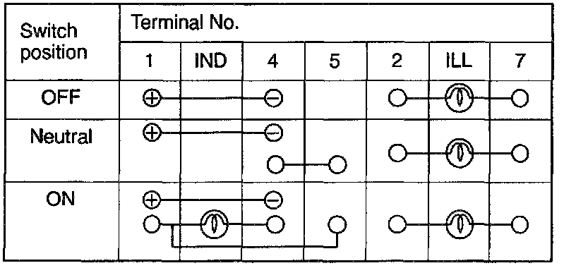 2. When the battery (+) side is connected to terminal 1 and the (-) side is connected to terminal 4, and the main switch is turned to ON, check if battery voltage is output between terminal 5 and the ground until the main switch is turned to OFF.