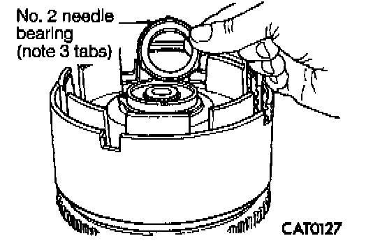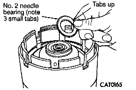 29. After removing reverse and overdrive clutches, install No. 2 needle bearing with 3 small tabs facing up.