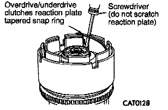 14. Remove overdrive/underdrive clutches reaction plate tapered snap ring. Do not scratch reaction plate.