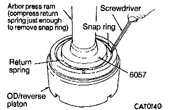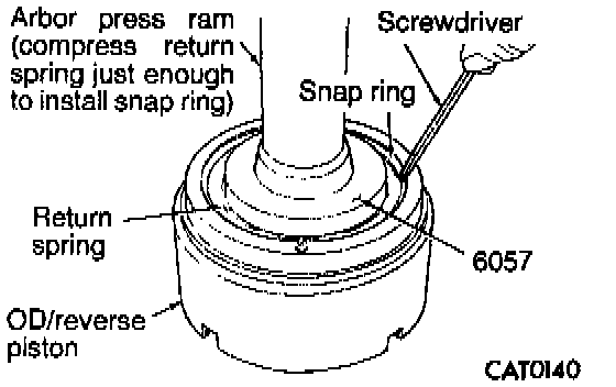 26. Remove snap ring with a screwdriver while compressing return spring with Disc 6057 and arbor press ram.